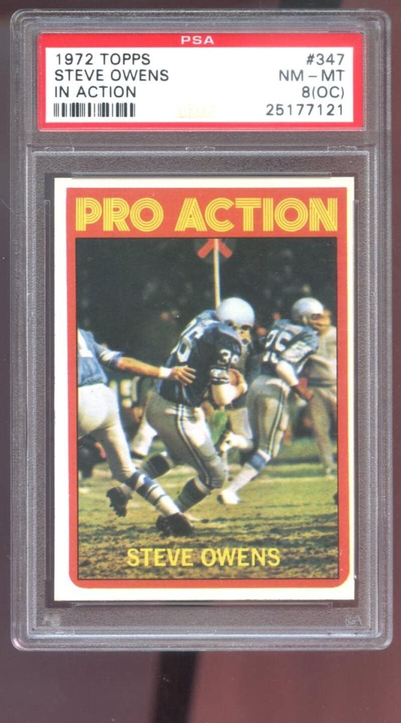 1972 Topps #347 Steve Owens Pro Action ROOKIE PSA 8 (OC) Graded Football Card HIGH NUMBER NFL In Action Detroit Lions. This listing is for a 1972 Topps #347 Steve Owens Pro Action ROOKIE NFL Graded Football Card graded by PSA as a PSA NM-MT 8 (OC). The card is shown in the first scan. The back of the card is shown in the second scan. Five cards are shown in the second scan, but only the one card described in the title and shown in the first scan is included. Match the PSA serial number of the card in the first scan to that in the second scan to determine which back corresponds to the card listed. Great card!