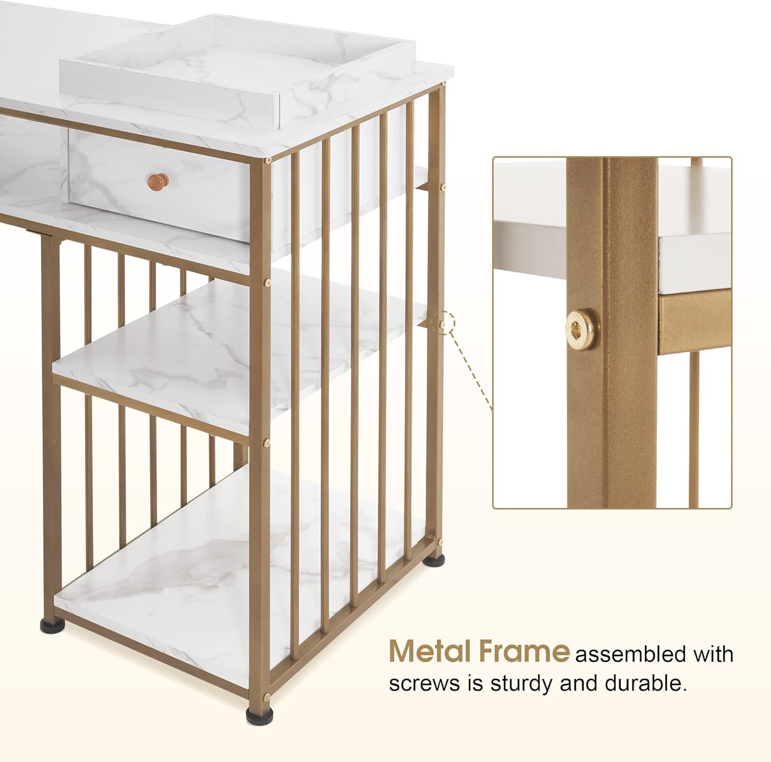 | Included Components | 2-layer split desktop, small container, drawer, open shelves, nail lamp, space for nail polish |