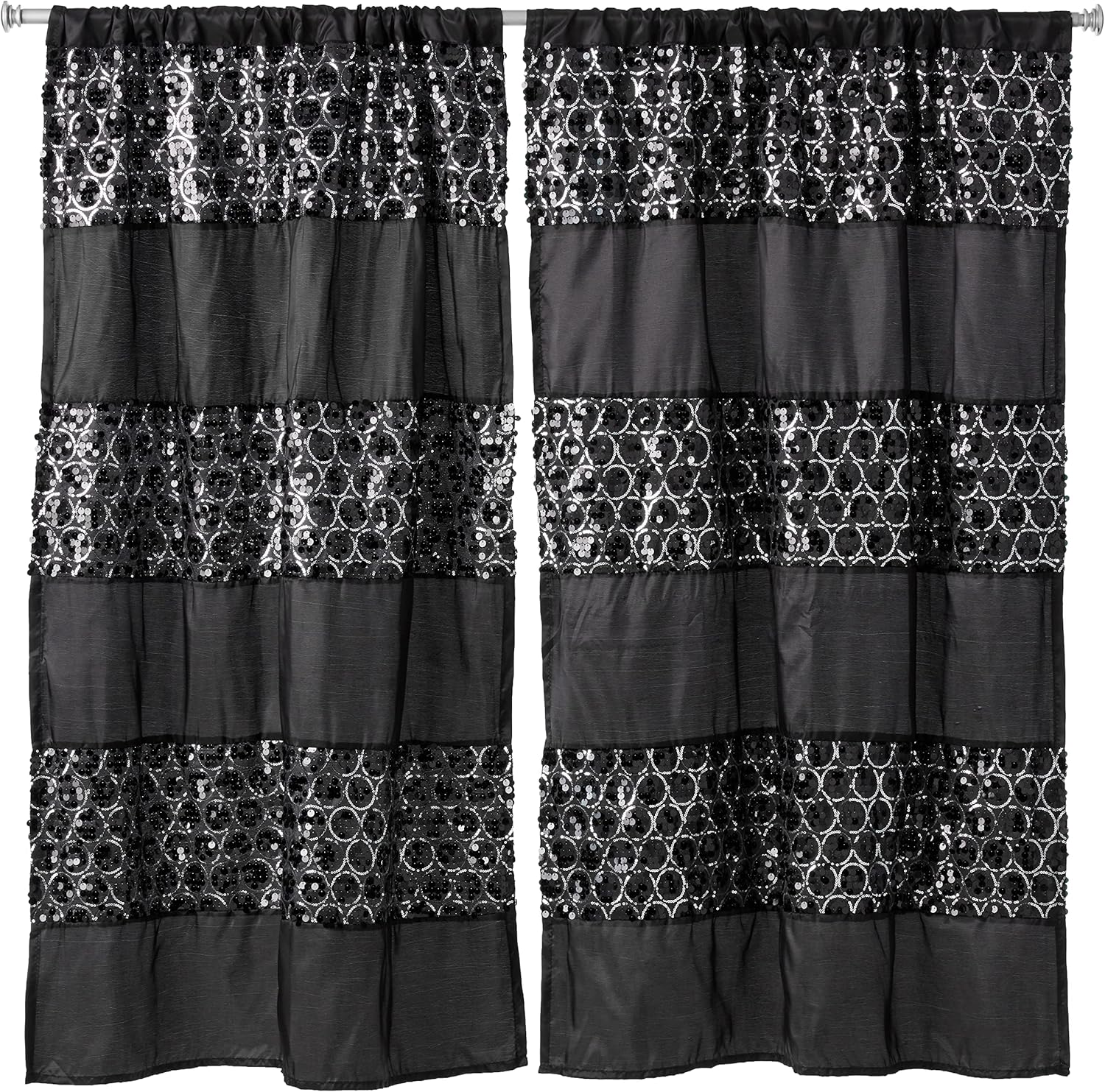 Add a glamourous touch of Hollywood style to your bathroom with this dazzling Sinatra shower curtain and matching accessories (all sold separately) a bands of silver sequins placed upon a metallic shower curtain This design is a beautiful chic fun update to your modern bathroom Coordinates with our matching bath accessories bath rug sand a 3 piece towel set The shower curtain is 100-percent polyester The towels are 100Percent cotton and the bath rugs are made of acrylic and polyester The bath accessories are crafted in resin Machine wash cold Hang to dry Made in China