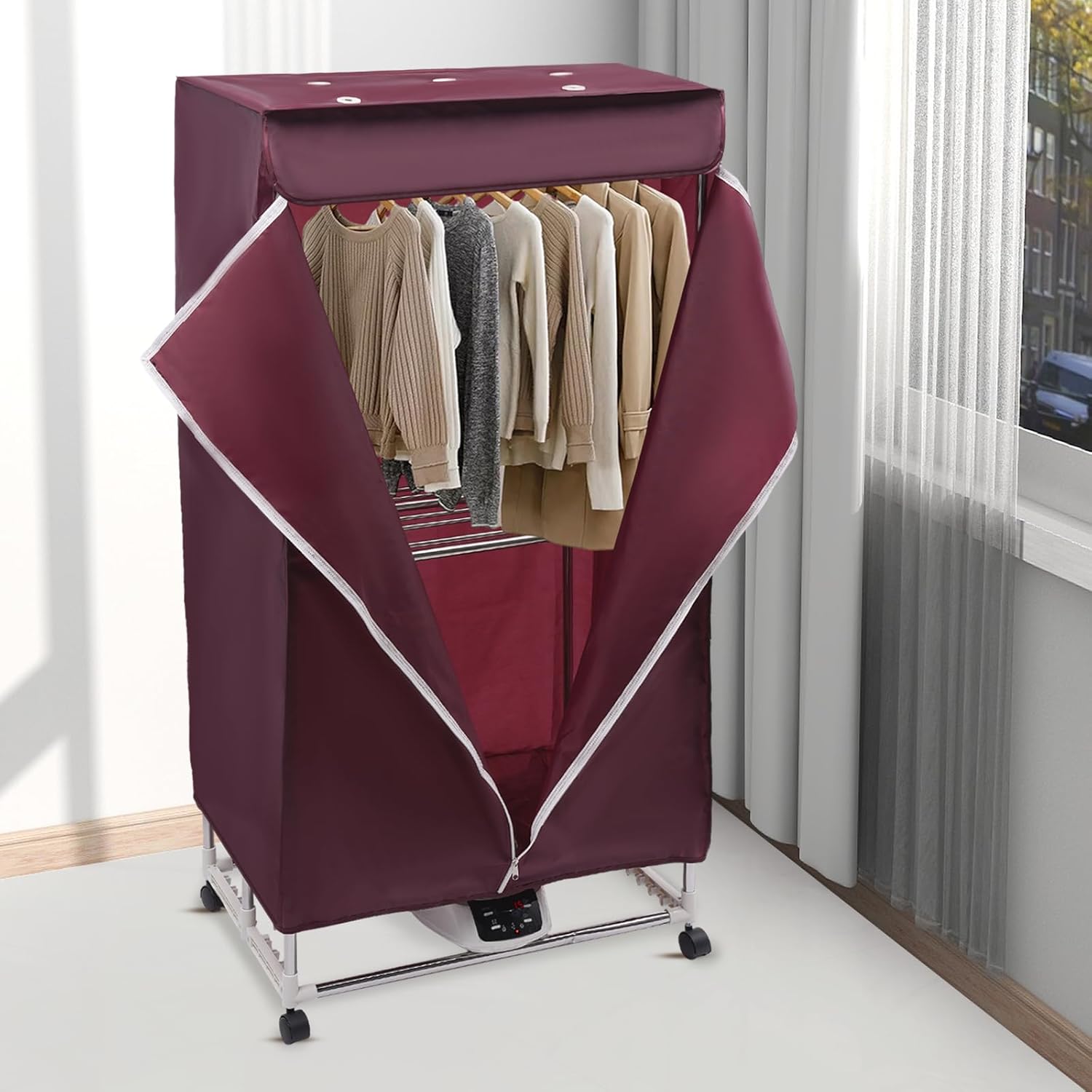 Are you bothered by the fact that your clothes are always not dry in the wet weather? Then you need this clothes dryer. This appliance alleviates the troublesome of clammy attire.★ Key FeaturesEasy to Store: Thanks to its lightweight (9.48 lbs) and foldable features, you can place it under your bed or behind the door without taking up too much space.★ DetailsConsiderate Bracket: You can switch between single-tier and double-tier through these brackets according to the different lengths of the clothes to meet the drying needs of all your family. Practical Cover: It is made of Oxford cloth, which can effectively ensure ventilation.★ SpecificationColor: Wine RedMaterial: Stainless Steel, PC, and Oxford ClothHeating Method: PTC 5-layer HeatingPower Source: Corded ElectricPlug: US StandardGrade: IPX1Power: 1200-1500WVoltage: 110VNoise: About 45 dBGears Adjustment: 3Timing Range: 0-240minWorking Temperature: 60-70℃/140-158°FLoad Capacity: 30kg/66.14lbsRemote Control Range: Within 5m/16.4ftNet Weight: 4.3kg/9.48lbsGross Weight: 4.8kg/10.58lbsProduct Size: 70*50*150cm/27.55*19.68*59inPackage Size: 71*24*22.5cm/ 27.95*9.45*8.86in★ Package Included1* Clothes Dryer1* Outer Cover4* Towel Rails4* Wheels1* Remote Control1* English ManualAll Accessories for Installation★ Notes1.Stainless steel tubing may be somewhat sharp, please wear gloves when installing (not included).2.Please note that when placing the dryer, please keep it at a distance of 3.94 inches from the ground.3.Please keep your clothes from dripping while drying.4.Please read the English manual carefully before use and pay particular attention to the safety instructions contained therein.