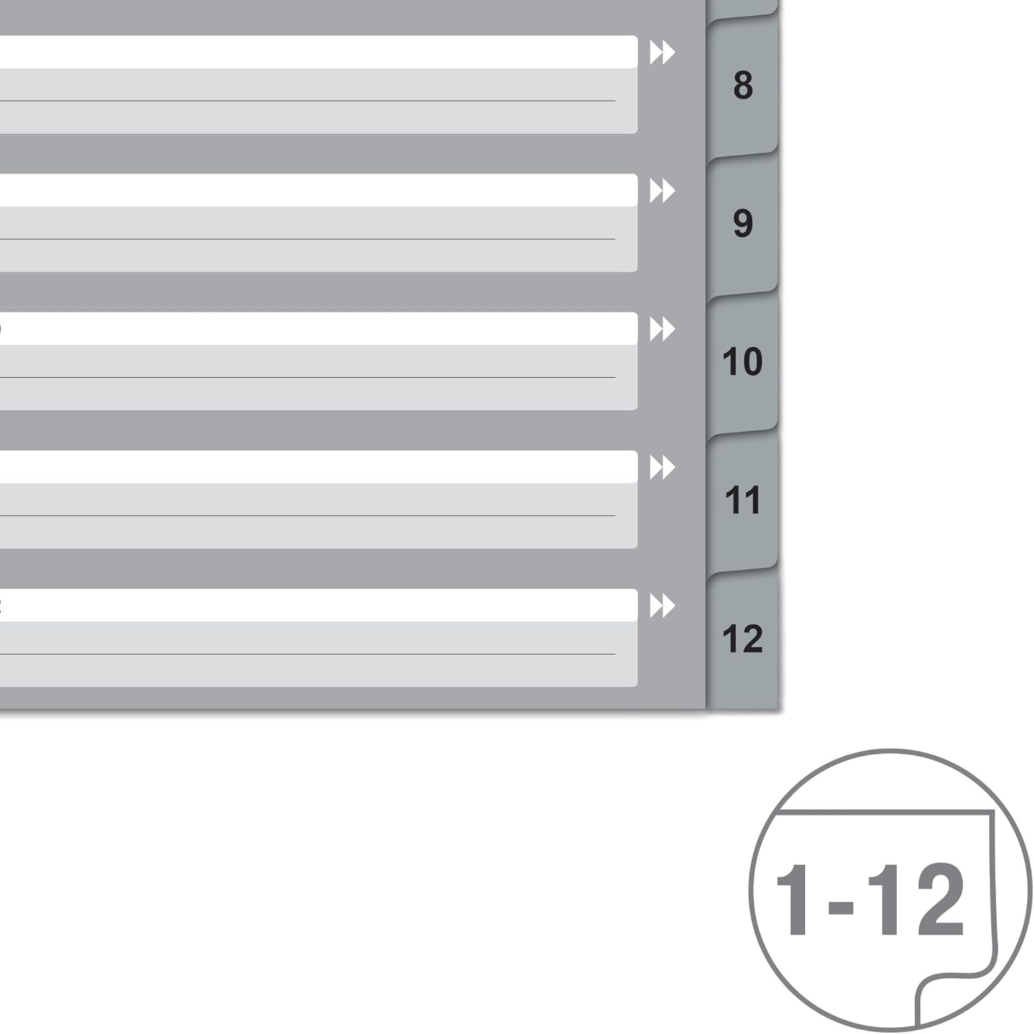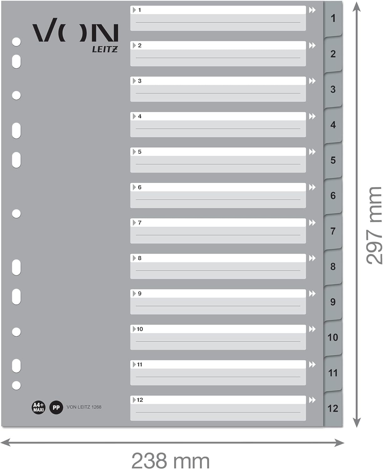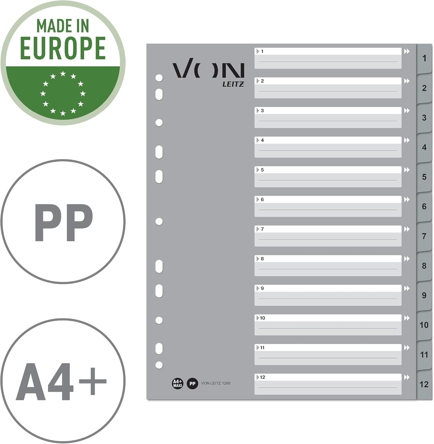 These numbered A4 dividers are your stylish and functional companion for a clear storage of important documents. The 12 extra wide tabs are equipped with strong, labeled polypropylene tabs from 1 to 12 and a customisable card front - making them ideal for filing and archiving, whether study, at work, at home, travelling or in the office. The printed front allows you to customise the dividers and the oversized format of the tabs makes it possible to use with transparent sleeves. So you can organise all important documents such as documents, school projects, recipes, letters, bills or notes in no time. Made from clear wipe clean acid free and indelible polypropylene plastic and sturdy cardboard for the highest quality and durability. Discover the proven quality of Leitz stationery. - Extra wide A4 index sheets with numbering from 1 to 12 for organising and filing documents - pack of 12 - Suitable for folders and ring binders - Ideal for transporting and storing documents. - Division by projects, categories or compartments. - With 12 blank polypropylene plastic tabs in different colours. - Printed cardboard front with plenty of space for labelling - A4 extra width, ideal for use with clear sleeves. - Universal 11-hole filing strip, compatible with folders and ring binders of different sizes - Made from durable 0.12mm polypropylene with 160gsm card front - Part of the high-quality VON stationery range from Leitz.